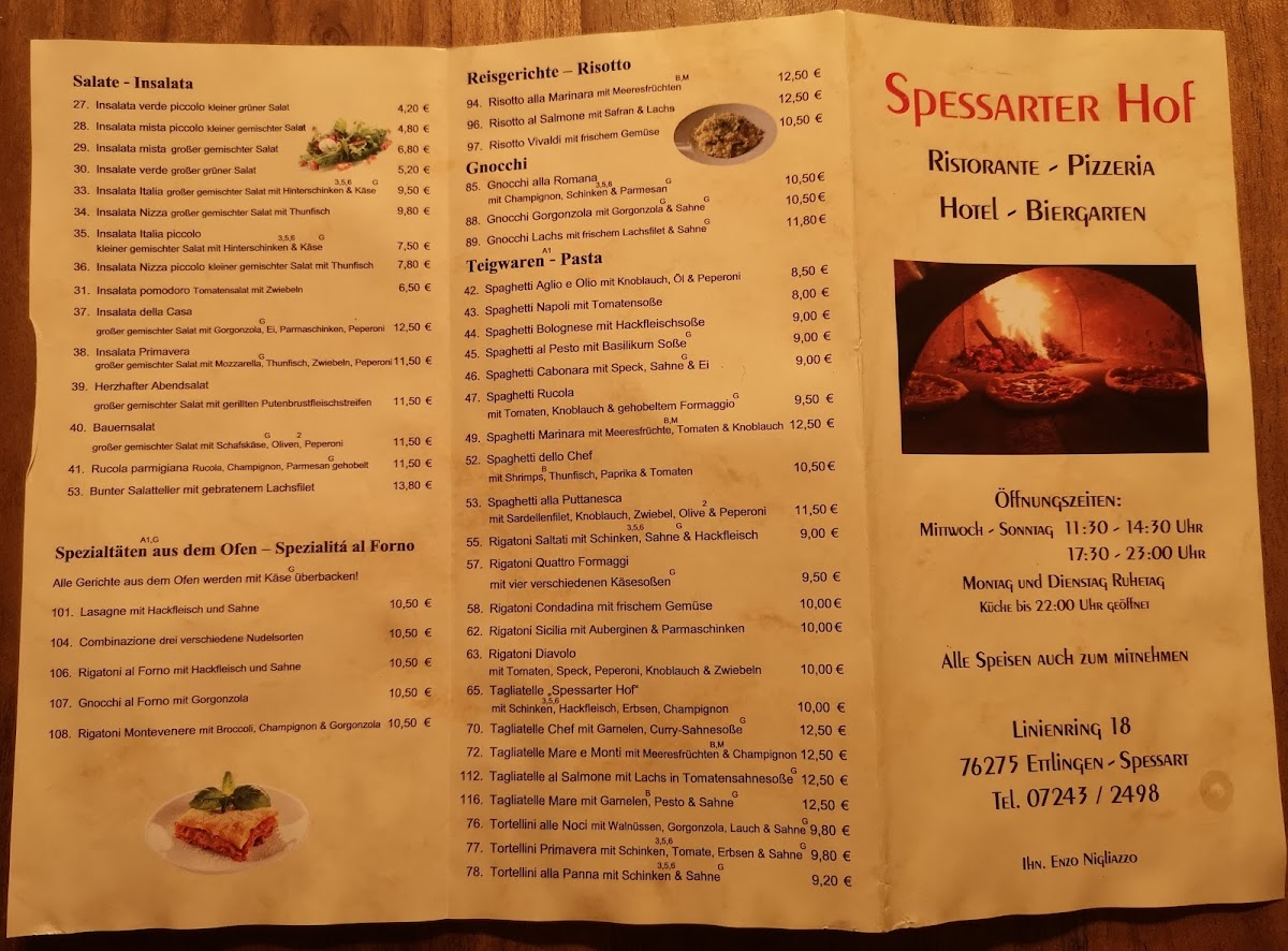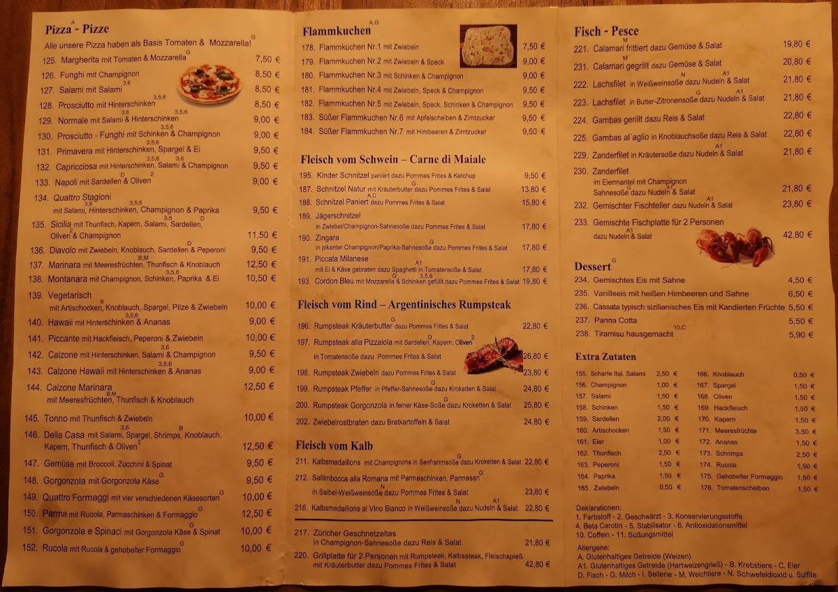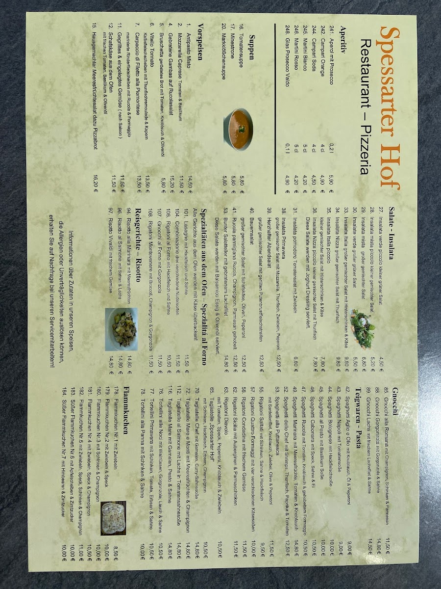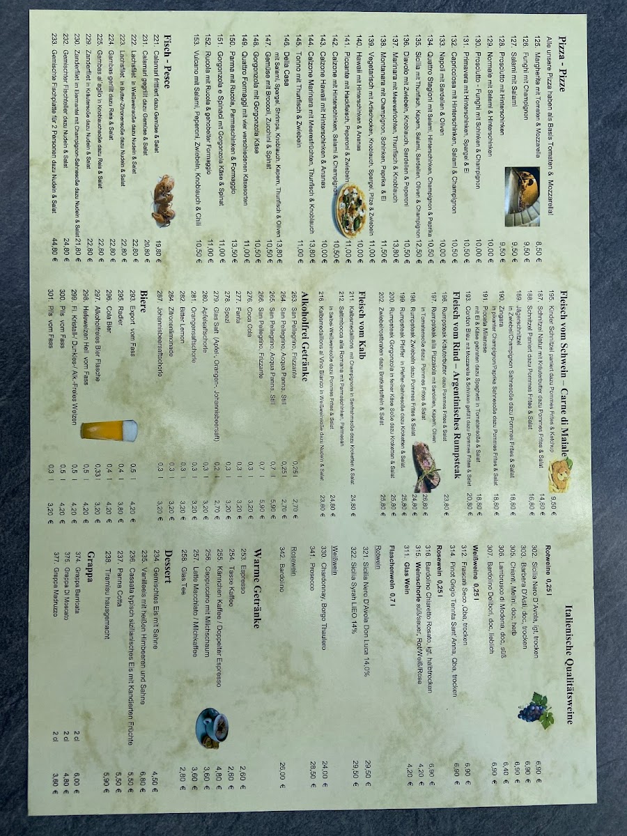The menu at Spessarter Hof reflects a clear focus on approachable Italian comfort food, with a lineup that balances classic pizzas, fresh salads, and traditional desserts. Among the desserts, Panna Cotta and Tiramisu Hausgemacht stand out as satisfying finales, offering a creamy and familiar sweetness that complements the savory dishes well. The pizza selection forms the heart of the menu, ranging from timeless staples like Pizza Margherita and Pizza Parma to richer combinations such as Pizza Prosciutto E Funghi and Pizza Hawaii, each appealing to different tastes without straying from recognizable flavors. For those seeking bolder notes, Pizza Picante delivers a spicier profile, while Siciliana Più Frutti Di Mare adds variety with its seafood-focused topping. Lighter options are also represented, notably Salat Nizza, which provides a refreshing contrast to the heavier pizza choices. Taken together, the menu feels coherent and well-curated, emphasizing well-known Italian dishes that are easy to enjoy and suitable for a wide range of diners, making the overall dining experience consistent and dependable rather than experimental.